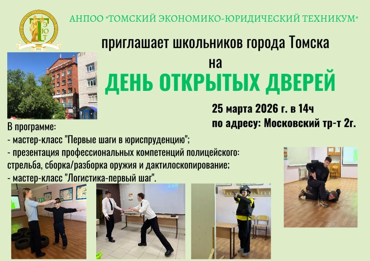25 марта в 14ч. АНПОО "Томский экономико-юридический техникум" приглашает школьников города Томска и области на День открытых дверей.